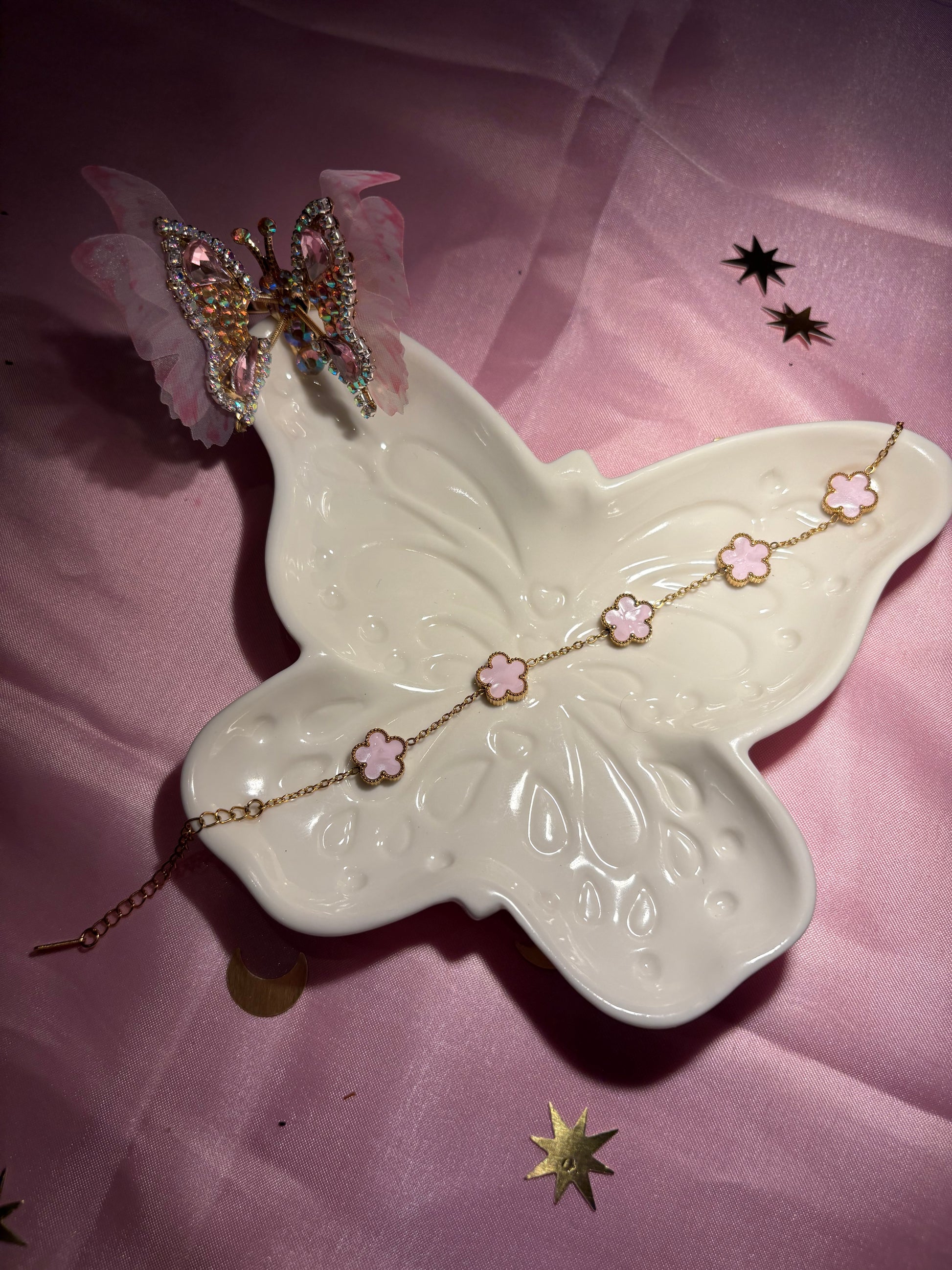 Ce bracelet a un chaîne fine et est doré avec des fleurs nacré rose, il est également ajustable afin de s’adapter à ton jolie poignet
